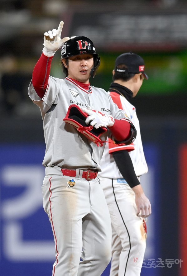 5일 수원KT위즈파크에서 ‘2022 신한은행 MY CAR KBO리그’ SSG 랜더스와 KT 위즈의 경기가 열렸다. 6회초 무사 1루 SSG 최정이 중전 2루타를 치고 2루에서 기뻐하고 있다 .