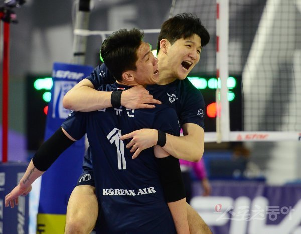 5일 인천계양체육관에서 열린 ‘2021~2022 도드람 V-리그’ 남자부 챔피언결정전 1차전 인천 대한항공과 의정부 KB손해보험의 경기에서 대한항공 정지석이 득점에 성공한 후 김규민과 기쁨을 나누고 있다.