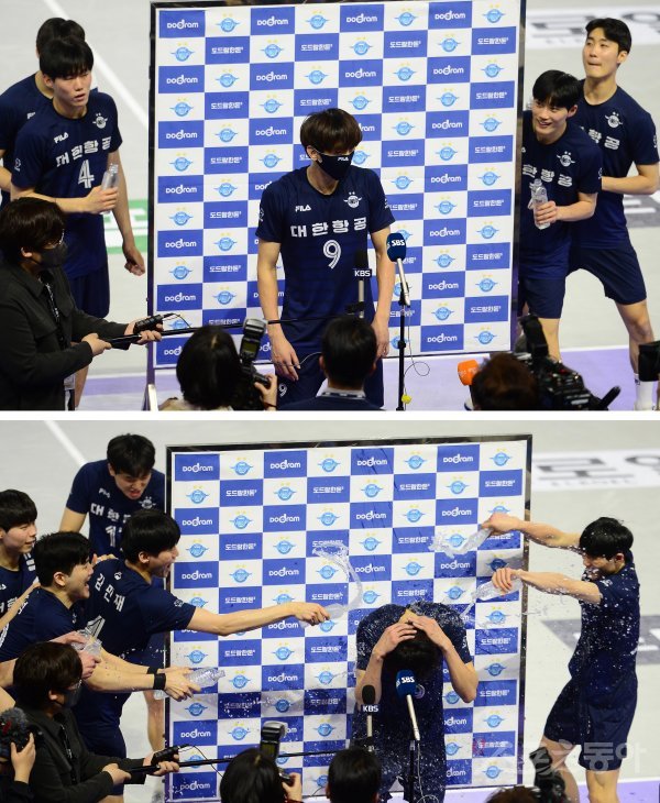 5일 인천계양체육관에서 열린 ‘2021~2022 도드람 V-리그’ 남자부 챔피언결정전 1차전 인천 대한항공과 의정부 KB손해보험의 경기에서 대한항공 곽승석이 수훈 인터뷰를 마치고 동료들에게 물 세리머니를 당하고 있다.