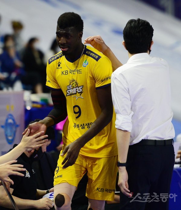 5일 인천계양체육관에서 열린 ‘2021~2022 도드람 V-리그’ 남자부 챔피언결정전 1차전 인천 대한항공과 의정부 KB손해보험의 경기에서 KB손해보험 케이타가 4세트에 교체되고 있다.