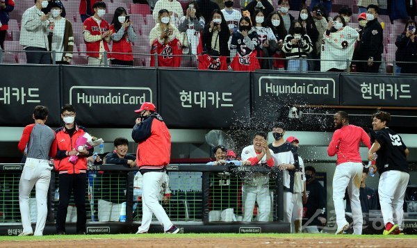 5일 광주기아챔피언스필드에서 ‘2022 신한은행 SOL KBO리그’ KIA 타이거즈와 한화 이글스의 경기가 열렸다. KIA가 한화를 상대로 4-3으로 승리한 뒤 첫 승을 달성한 김종국 감독이 선수들의 물세례를 받고 있다.