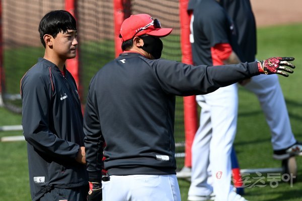 6일 광주기아챔피언스필드에서 ‘2022 신한은행 SOL KBO리그’ KIA 타이거즈와 한화 이글스의 경기가 열린다. 경기에 앞서 KIA 김도영이 훈련도중 김민우 코치와 이야기를 나누고 있다.