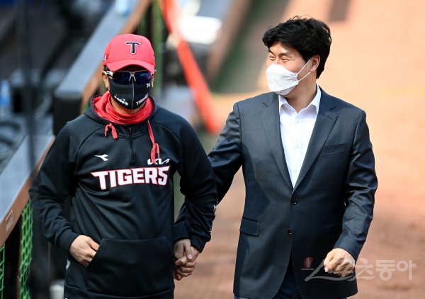 6일 광주기아챔피언스필드에서 ‘2022 신한은행 SOL KBO리그’ KIA 타이거즈와 한화 이글스의 경기가 열린다. 경기에 앞서 KIA 김종국 감독과 장성호 해설위원이 이야기를 나누고 있다.