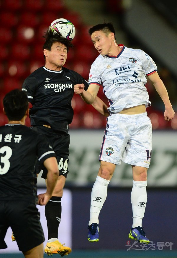 6일 경기도 탄천종합운동장에서 열린 ‘하나원큐 K리그1 2022’ 성남 FC와 김천 상무의 경기에서 성남 박수일이 김천 김한길의 앞에서 헤딩을 하고 있다.