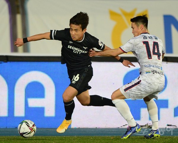 6일 경기도 탄천종합운동장에서 열린 ‘하나원큐 K리그1 2022’ 성남 FC와 김천 상무의 경기에서 성남 박수일이 김천 김한길의 수비를 피해 드리블 하고 있다.