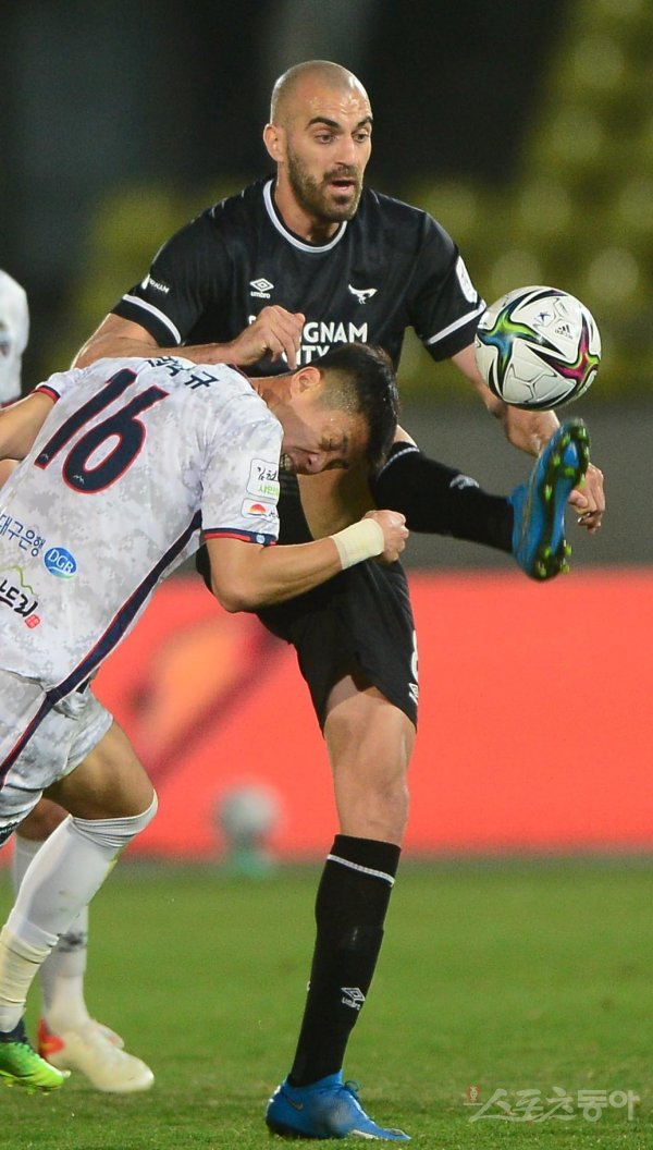 6일 경기도 탄천종합운동장에서 열린 ‘하나원큐 K리그1 2022’ 성남 FC와 김천 상무의 경기에서 김천 권혁규가 성남 뮬리치를 향해 머리를 들이대고 있다.