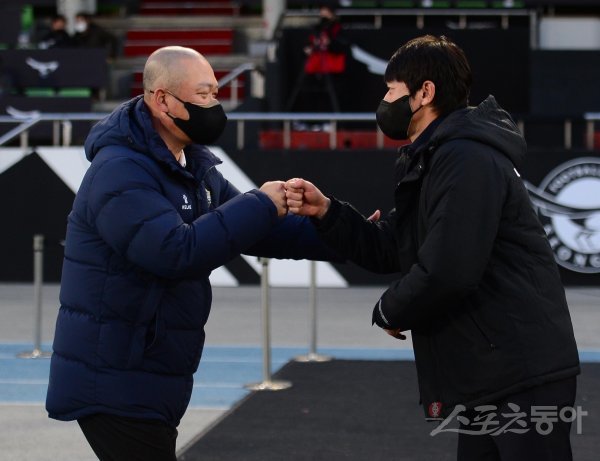 6일 경기도 탄천종합운동장에서 열린 ‘하나원큐 K리그1 2022’ 성남 FC와 김천 상무의 경기에 앞서 김천 김태완 감독과 성남 김남일 감독이 주먹 인사를 하고 있다.