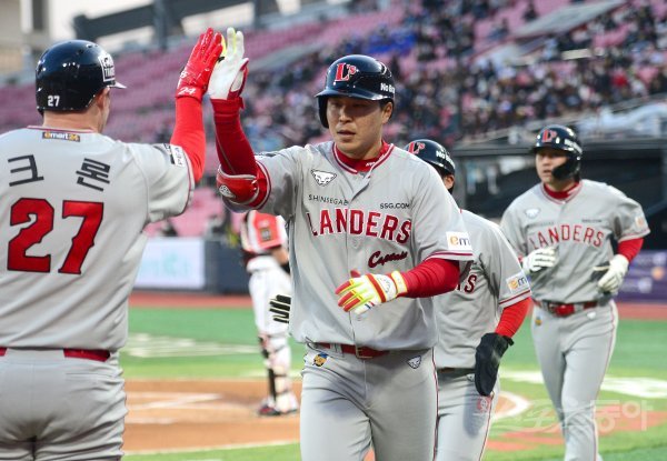 6일 수원KT위즈파크에서 ‘2022 신한은행 MY CAR KBO리그’ SSG 랜더스와 KT 위즈의 경기가 열렸다. 1회초 1사 1,2루 SSG 한유섬이 우월 스리런 홈런을 날리고 그라운드를 돌아 홈인해 하이파이브 하고 있다.