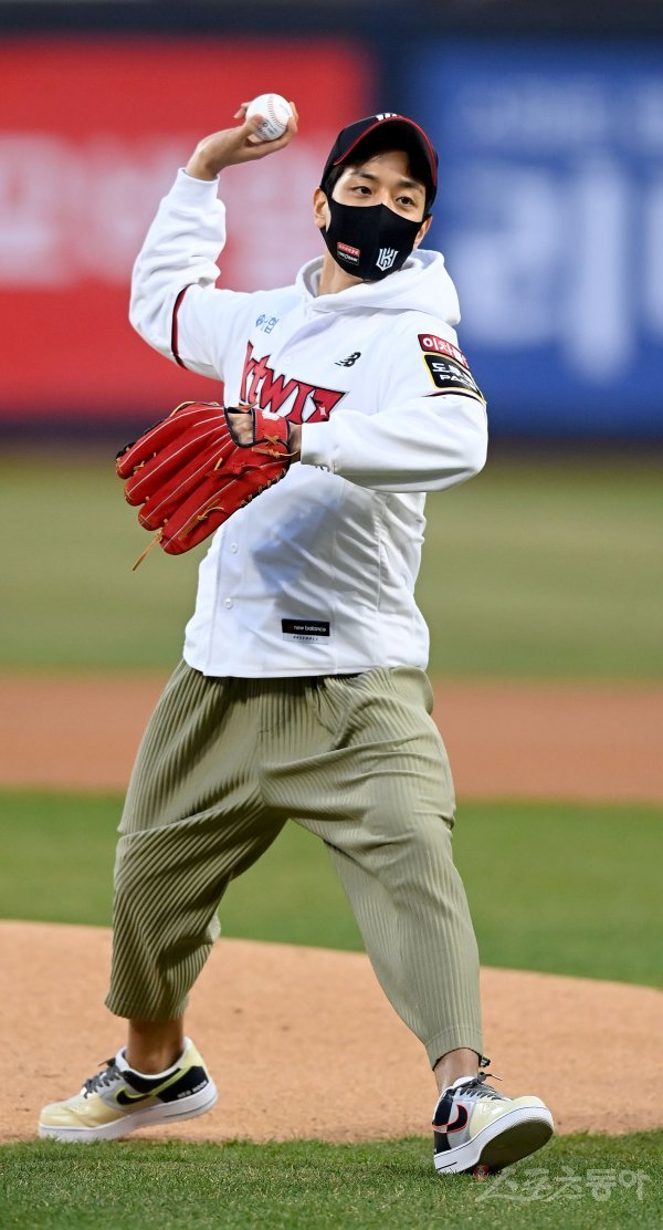 6일 수원KT위즈파크에서 ‘2022 신한은행 MY CAR KBO리그’ SSG 랜더스와 KT 위즈의 경기가 열렸다. 경기 전 KT 농구단 허훈이 시구를 하고 있다.