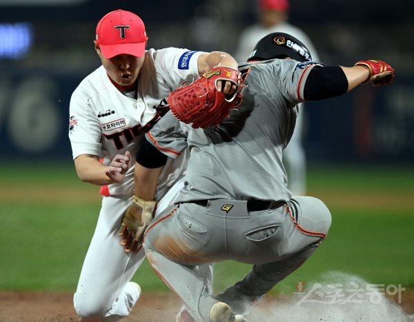 6일 광주기아챔피언스필드에서 ‘2022 신한은행 SOL KBO리그’ KIA 타이거즈와 한화 이글스의 경기가 열렸다. 5회초 2사 3루에서 폭투 때 한화 3루 주자 정민규가 KIA 윤중현의 태그를 피해 득점을 올리고 있다.