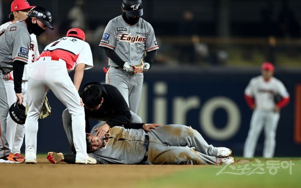 6일 광주기아챔피언스필드에서 ‘2022 신한은행 SOL KBO리그’ KIA 타이거즈와 한화 이글스의 경기가 열렸다. 4회초 무사 1루에서 한화 노시환이 폭투 때 2루까지 진루하다 2루 송구를 맞은 뒤 고통을 호소하고 있다.
