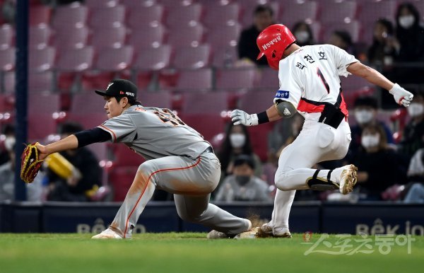 6일 광주기아챔피언스필드에서 ‘2022 신한은행 SOL KBO리그’ KIA 타이거즈와 한화 이글스의 경기가 열렸다. 5회말 무사에서 KIA 박찬호가 내야안타로 출루하고 있다.