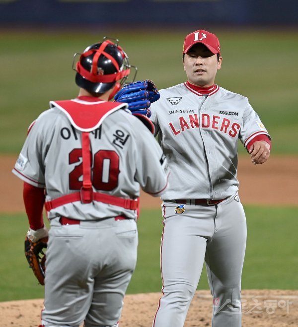 6일 수원KT위즈파크에서 ‘2022 신한은행 MY CAR KBO리그’ SSG 랜더스와 KT 위즈의 경기가 열렸다. 9회말 등판해 1이닝을 무실점으로 막으며 세이브를 따낸 SSG 김택형이 하이파이브 하고 있다.