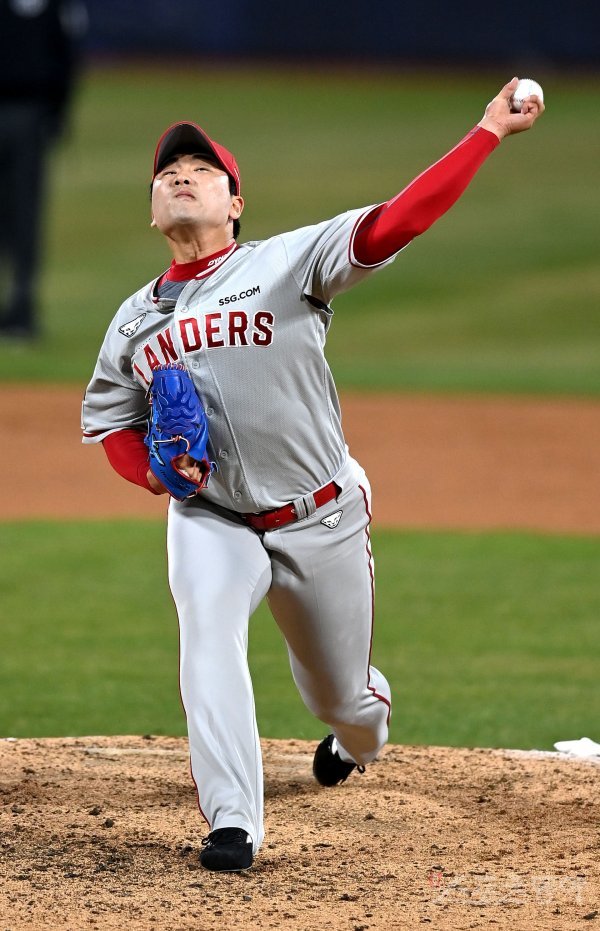 6일 수원KT위즈파크에서 ‘2022 신한은행 MY CAR KBO리그’ SSG 랜더스와 KT 위즈의 경기가 열렸다. 9회말 등판해 1이닝을 무실점으로 막으며 세이브를 따낸 SSG 김택형이 역투하고 있다.