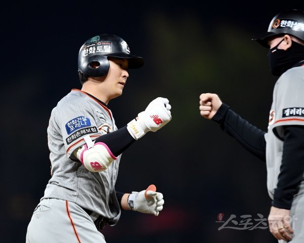 6일 광주기아챔피언스필드에서 ‘2022 신한은행 SOL KBO리그’ KIA 타이거즈와 한화 이글스의 경기가 열렸다. 7회초 무사 1, 2루에서 한화 정은원이 3점 홈런을 쏘아 올린 후 코치의 환영을 받고 있다.