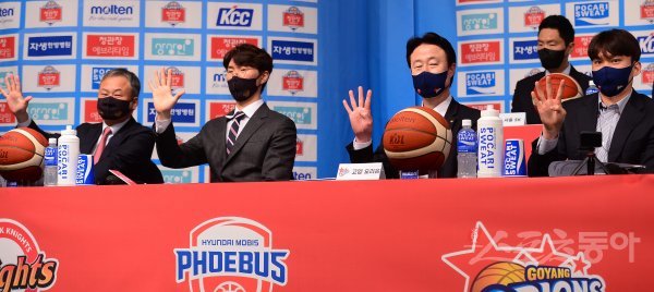 7일 서울 강남구 청담동 호텔리베라 청담에서 열린 ‘2021-2022 KGC인삼공사 정관장 프로농구’ 플레이오프 미디어데이에서 울산 현대모비스 유재학 감독, 이우석, 오리온 강을준 감독, 이대성이 진행자의 질문에 답하고 있다.