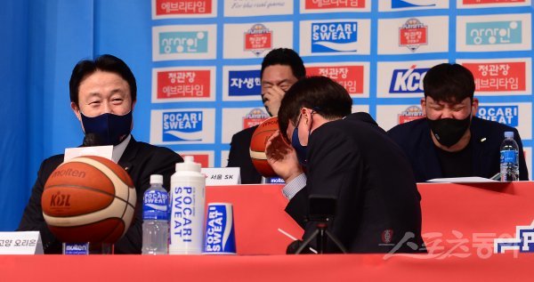 7일 서울 강남구 청담동 호텔리베라 청담에서 열린 ‘2021-2022 KGC인삼공사 정관장 프로농구’ 플레이오프 미디어데이에서 고양 강을준 감독이 재치있는 답변에 이대성, 전희철 감독, 최준용이 웃음을 터뜨리고 있다.
