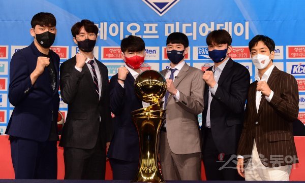 7일 서울 강남구 청담동 호텔리베라 청담에서 열린 ‘2021-2022 KGC인삼공사 정관장 프로농구’ 플레이오프 미디어데이에서 SK 최준용, 현대모비스 이우석, 한국가스공사 김낙현, KGC 전성현, 오리온 이대성, KT 허훈이 트로피 앞에서 포즈를 취하고 있다.