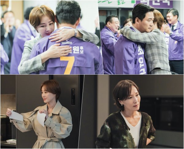 그런 가운데 공개된 사진에는 축제 분위기로 가득한 인국의 선거 사무실 현장이 담겼다. 선거 캠프 사람들의 환호 속에서 인국을 끌어안은 옥선. 무언가를 속삭이는 옥선의 표정이 은밀하기까지 하지만, 누구보다 기뻐야 할 순간 꼼짝없이 얼어붙은 인국의 굳은 얼굴도 흥미롭다. 그의 기만을 들춰내며 ‘최악의 하루’를 예고했던 옥선이 과연 무슨 말을 전한 것일지 궁금증을 자극한다.