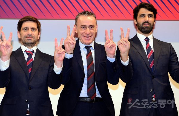 7일 경기도 파주 NFC(축구대표팀 트레이닝센터)에서 ‘2022 카타르월드컵’ 아시아 최종예선 결산 및 본선 조편성 관련 미디어데가 열렸다. 축구대표팀 벤투 감독(가운데)이 포즈를 취하고 있다.