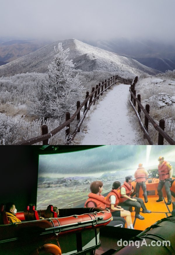 4월 초의 봄날임에도 나뭇가지마다 상고대가 하얗게 피어난 함백산(위)과 실제 재난 현장을 유사하게 재현한 4D 시큘레이터