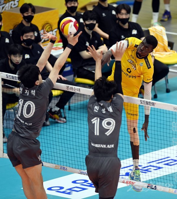 7일 경기도 의정부실내체육관에서 ‘2021-2022 도드람 V리그’ 인천 대한항공과 의정부 KB손해보험의 남자부 챔프전 경기가 열렸다. KB손해보험 케이타가 대한항공 블로커를 피해 스파이크를 날리고 있다.