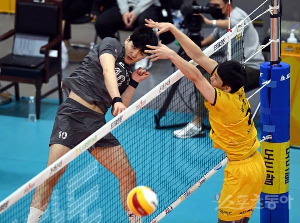 7일 경기도 의정부실내체육관에서 ‘2021-2022 도드람 V리그’ 인천 대한항공과 의정부 KB손해보험의 남자부 챔프전 경기가 열렸다. 대한항공 정지석이 KB손해보험 블로커를 피해 스파이크를 날리고 있다.