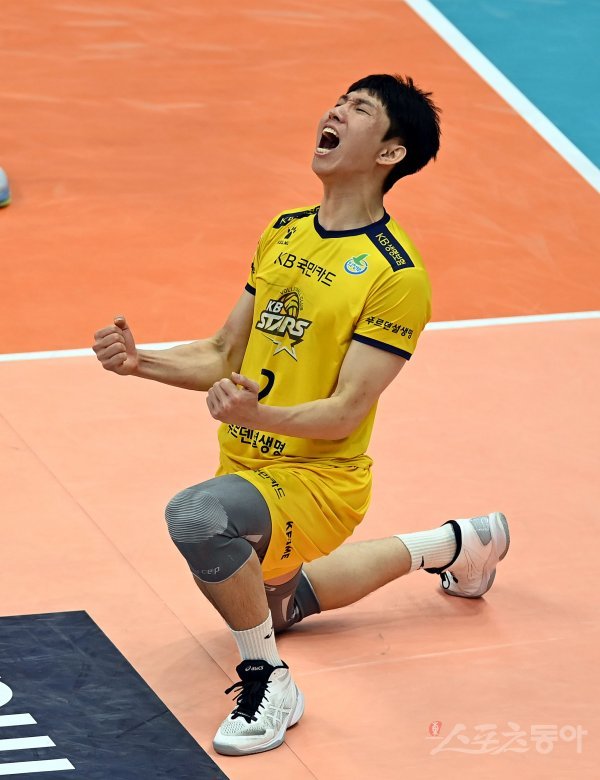 7일 경기도 의정부실내체육관에서 ‘2021-2022 도드람 V리그’ 인천 대한항공과 의정부 KB손해보험의 남자부 챔프전 경기가 열렸다. KB손해보험 황택의가 서브 득점을 성공 시킨 후 포효하고 있다.