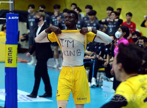 7일 경기도 의정부실내체육관에서 ‘2021-2022 도드람 V리그’ 인천 대한항공과 의정부 KB손해보험의 남자부 챔프전 경기가 열렸다. KB손해보험이 대한항공을 세트스코어 3-1로 승리한 뒤 케이타가 세리머니를 펼치고 있다.