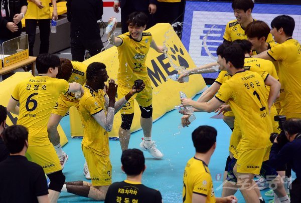 7일 경기도 의정부실내체육관에서 ‘2021-2022 도드람 V리그’ 인천 대한항공과 의정부 KB손해보험의 남자부 챔프전 경기가 열렸다. KB손해보험이 대한항공을 세트스코어 3-1로 승리한 뒤 수훈선수 케이타가 동료들로부터 물세례를 받고 있다.