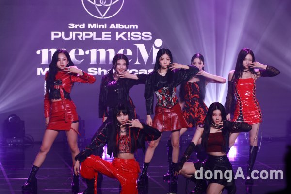 그룹 퍼플키스(PURPLE KISS)가 6일 세 번째 미니앨범 ‘memeM’ 컴백 기념 쇼케이스에서 무대를 선보이고 있다.