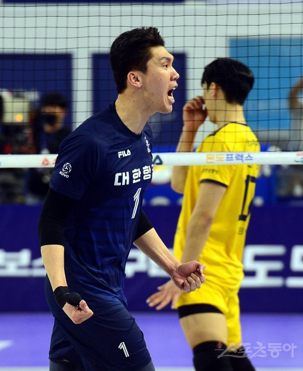9일 인천 계양체육관에서 ‘2021-2022 도드람 V리그’ 인천 대한항공과 의정부 KB손해보험의 남자부 챔프전 경기가 열렸다. 대한항공 김규민이 가로막기를 성공시킨 후 환호하고 있다.