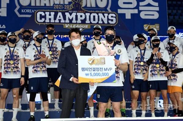 9일 인천 계양체육관에서 ‘2021-2022 도드람 V리그’ 인천 대한항공과 의정부 KB손해보험의 남자부 챔프전 경기가 열렸다. 대한항공이 KB손해보험을 꺾고 통합우승 차지한 뒤 조원태 KOVO총재와 MVP를 수상한 링컨이 기념촬영을 하고 있다.