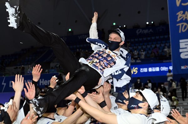 9일 인천 계양체육관에서 ‘2021-2022 도드람 V리그’ 인천 대한항공과 의정부 KB손해보험의 남자부 챔프전 경기가 열렸다. 대한항공이 KB손해보험을 꺾고 통합우승 차지한 뒤 토미 틸리카이넨 감독이 헹가래를 받고 있다.