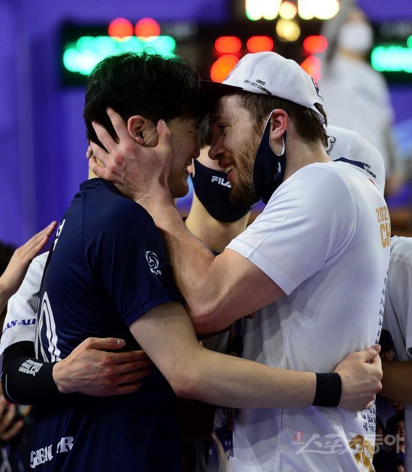 9일 인천 계양체육관에서 ‘2021-2022 도드람 V리그’ 인천 대한항공과 의정부 KB손해보험의 남자부 챔프전 경기가 열렸다. 대한항공이 KB손해보험을 꺾고 통합우승 차지한 뒤 정지석과 링컨이 기쁨을 나누고 있다.