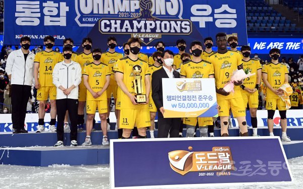 9일 인천 계양체육관에서 ‘2021-2022 도드람 V리그’ 인천 대한항공과 의정부 KB손해보험의 남자부 챔프전 경기가 열렸다. 대한항공에 패하며 준우승을 차지한 KB손해보험이 기념촬영을 하고 있다.