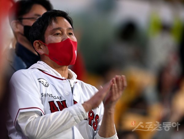 9일 인천 SSG 랜더스필드에서 ‘2022 신한은행 SOL KBO리그’ SSG 랜더스와 KIA 타이거즈의 경기가 열렸다. SSG가 KIA를 상대로 9-5로 승리한 뒤 정용진 SSG 구단주가 선수들을 격려하고 있다.
