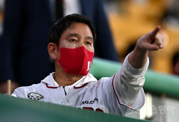 9일 인천 SSG 랜더스필드에서 ‘2022 신한은행 SOL KBO리그’ SSG 랜더스와 KIA 타이거즈의 경기가 열렸다. SSG가 KIA를 상대로 9-5로 승리한 뒤 정용진 SSG 구단주가 선수들을 격려하고 있다.