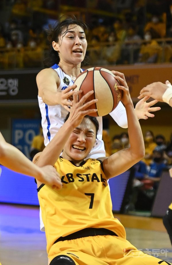 10일 충북 청주체육관에서 열린 ‘삼성생명 2021-2022 여자프로농구’ 청주 KB와 아산 우리은행의 챔피언결정전 1차전 경기에서 KB 최희진이 리바운드 볼을 잡는 과정에서 넘어지고 있다.