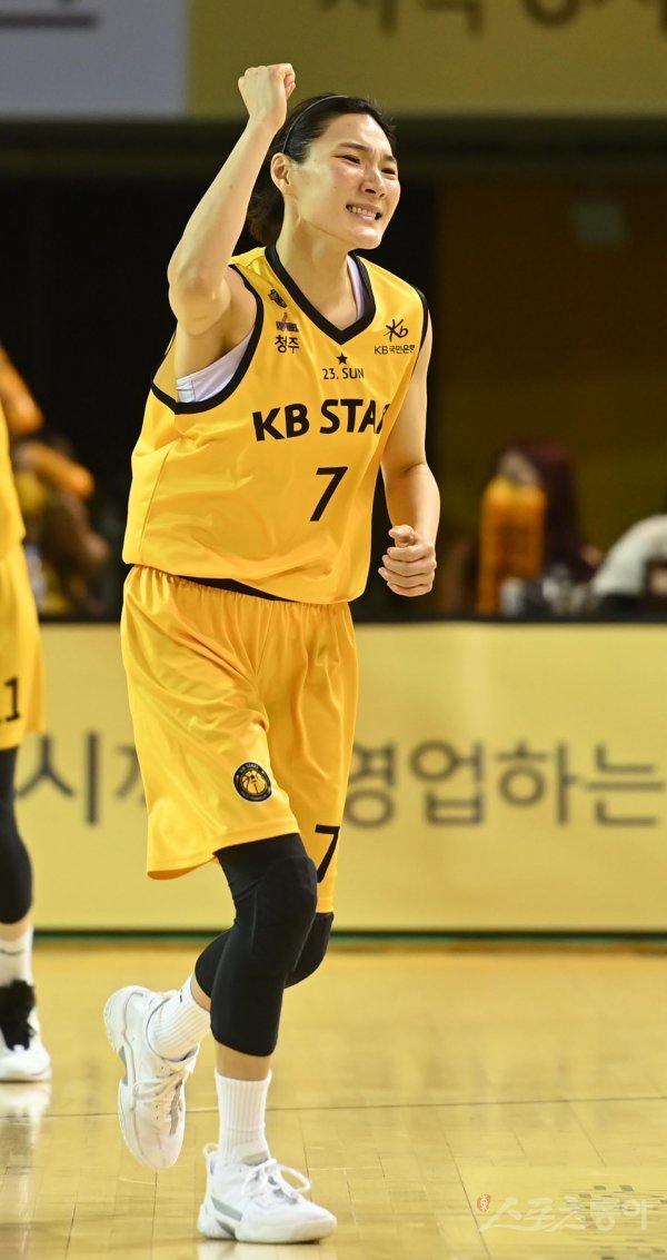 10일 충북 청주체육관에서 열린 ‘삼성생명 2021-2022 여자프로농구’ 청주 KB와 아산 우리은행의 챔피언결정전 1차전 경기에서 KB 최희진이 3점슛을 성공시킨 후 기뻐하고 있다.