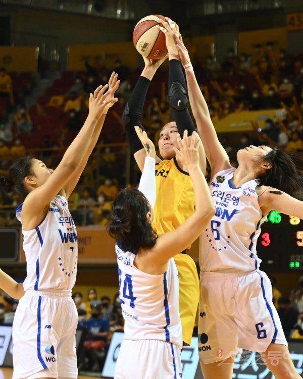 10일 충북 청주체육관에서 열린 ‘삼성생명 2021-2022 여자프로농구’ 청주 KB와 아산 우리은행의 챔피언결정전 1차전 경기에서 KB 박지수가 우리은행 수비 사이에서 리바운드 볼을 잡고 있다.