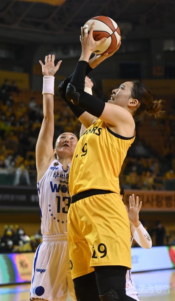 10일 충북 청주체육관에서 열린 ‘삼성생명 2021-2022 여자프로농구’ 청주 KB와 아산 우리은행의 챔피언결정전 1차전 경기에서 KB 박지수가 우리은행 김정은의 앞에서 슛을 하고 있다.