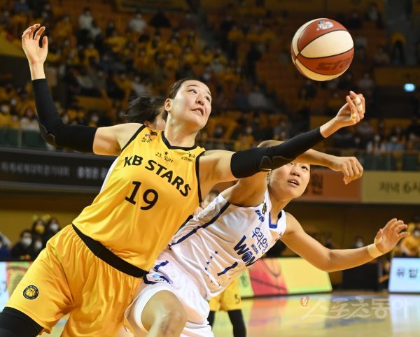 10일 충북 청주체육관에서 열린 ‘삼성생명 2021-2022 여자프로농구’ 청주 KB와 아산 우리은행의 챔피언결정전 1차전 경기에서 KB 박지수가 우리은행 박지현의 앞에서 리바운드 볼을 잡고 있다.