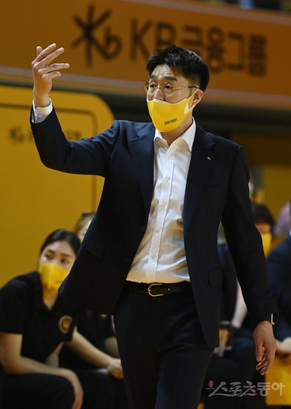 10일 충북 청주체육관에서 열린 ‘삼성생명 2021-2022 여자프로농구’ 청주 KB와 아산 우리은행의 챔피언결정전 1차전 경기에서 KB 김완수 감독이 선수 교체를 지시하고 있다.