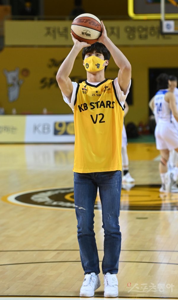 10일 충북 청주체육관에서 열린 ‘삼성생명 2021-2022 여자프로농구’ 청주 KB와 아산 우리은행의 챔피언결정전 1차전 경기에 앞서 수영 황선우가 시투하고 있다.