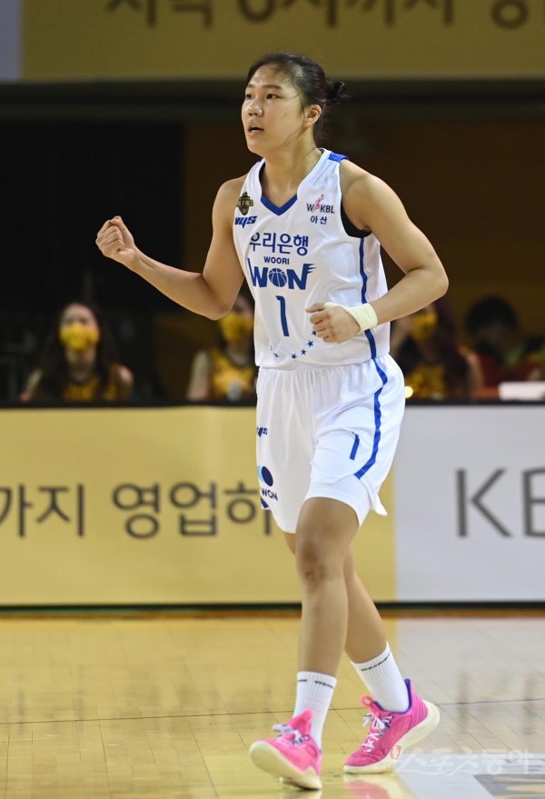 10일 충북 청주체육관에서 열린 ‘삼성생명 2021-2022 여자프로농구’ 청주 KB와 아산 우리은행의 챔피언결정전 1차전 경기에서 우리은행 박지현이 3점슛을 성공시킨 후 기뻐하고 있다.