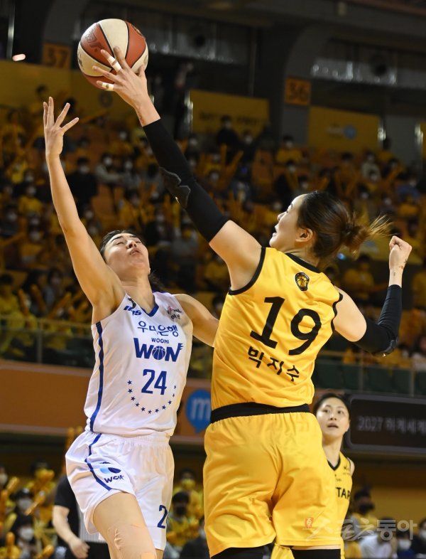10일 충북 청주체육관에서 열린 ‘삼성생명 2021-2022 여자프로농구’ 청주 KB와 아산 우리은행의 챔피언결정전 1차전 경기에서 KB박지수가 우리은행 김소니아의 슈팅을 블록슛하고 있다.