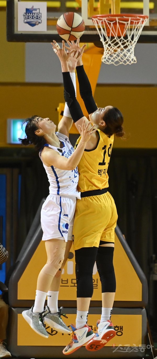 10일 충북 청주체육관에서 열린 ‘삼성생명 2021-2022 여자프로농구’ 청주 KB와 아산 우리은행의 챔피언결정전 1차전 경기에서 우리은행 김소니아와 KB 박지수가 리바운드 경합을 하고 있다.
