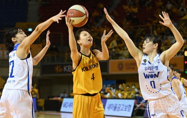 10일 충북 청주체육관에서 열린 ‘삼성생명 2021-2022 여자프로농구’ 청주 KB와 아산 우리은행의 챔피언결정전 1차전 경기에서 KB 박은하가 우리은행의 수비 사이에서 슛을 하고 있다.