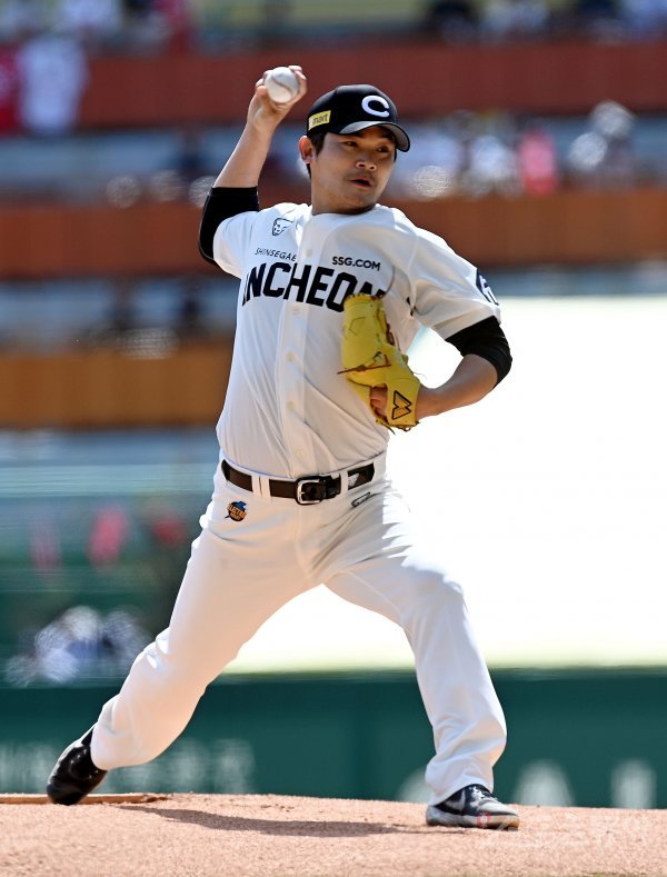 10일 인천 SSG 랜더스필드에서 ‘2022 신한은행 SOL KBO리그’ SSG 랜더스와 KIA 타이거즈의 경기가 열렸다. SSG 선발투수 노경은이 힘차게 볼을 던지고 있다.